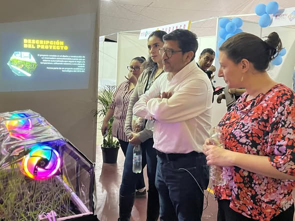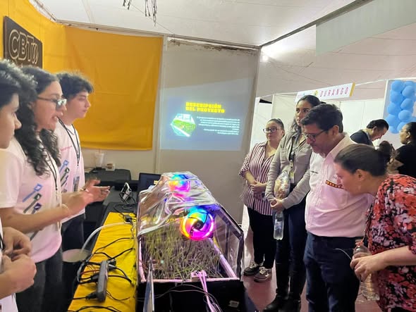 El equipo participante en exhibición mecatrónica, acompañado de su asesor Alonso Vázquez, recibe una felicitación de parte del director general de la DGETAYCM