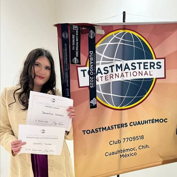 Samantha Gallegos, estudiante de biotecnología, tuvo una destacada participación en el concurso de oratoria organizado por el Club Toastmasters, Cuauhtémoc, al obtener un primer lugar en discurso