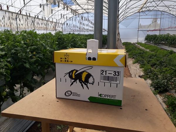 Aquí están los abejorros polinizando a las flores de las plantas de tomate del invernadero de la colmena del CBTa 90....